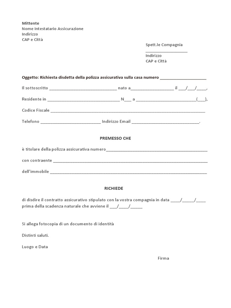 Modulo Disdetta Assicurazione Casa: FAC SIMILE e Consigli Top - Affari Miei intendo comunicarvi con questa lettera la volontà irrevocabile e certa di disdire il contratto di assicurazione stipulato presso la vostra compagnia. La scadenza naturale della stessa è il ……………………….. Di seguito trovate gli estremi della stessa polizza assicurativa da me sottoscritta: numero di polizza…………….. immobile………………. contraente……………..